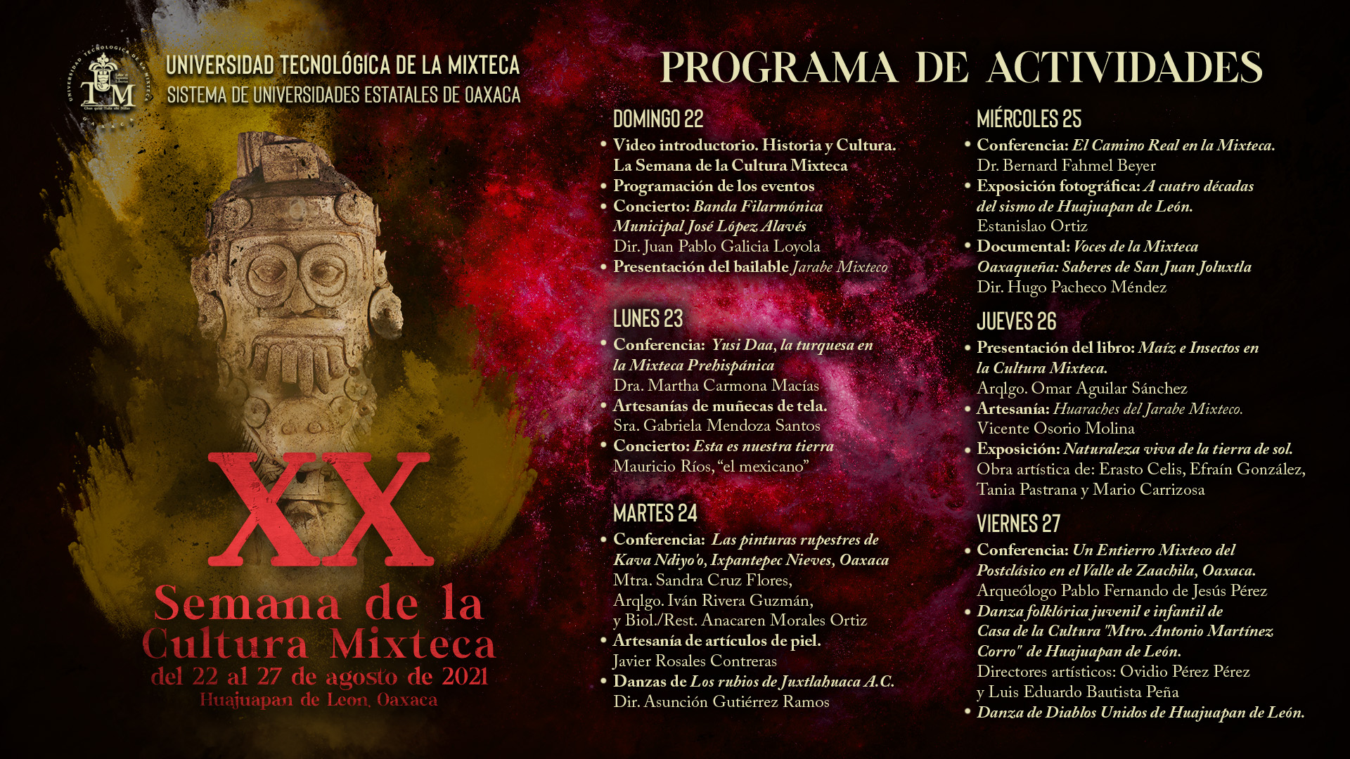 Del Domingo 22 al viernes 27 del mes de agosto del 2021 se efectuó la Vigésima Semana de la Cultura Mixteca. En el año 2020 se canceló de manera abrupta por las razones de la emergencia sanitaria. Con aún circunstancias inciertas para el año 2021 se llevó a cabo de manera virtual. Así se realizó una programación de una hora diariamente, transmitida por el canal YouTube del Sistema de Universidades Estatales de Oaxaca. Se prepararon videos para cada día con los objetivos de esta celebración, que pretende preservar la riqueza histórica, arqueológica y cultural de nuestra Región y mostrar con regocijo las manifestaciones actuales en el ámbito artístico, musical, artesanal y de las danzas folklóricas.